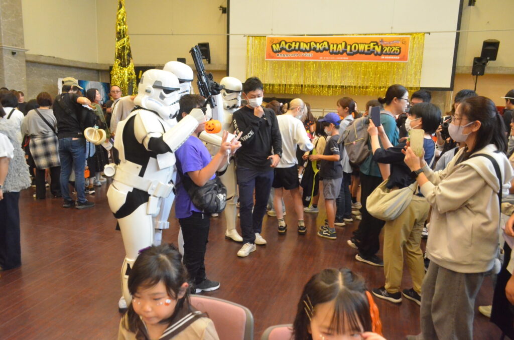 また、「まちあるきイベント」は30店舗ほどが参加し、子どもたちは合言葉を伝え、お菓子をもらっていた。このほか、5カ所にフォトスポットも設置。スペシャルゲストのスター・ウォーズのコスプレ団体、第501軍団日本舞台もあちこちに登場し、記念撮影に応じていた。