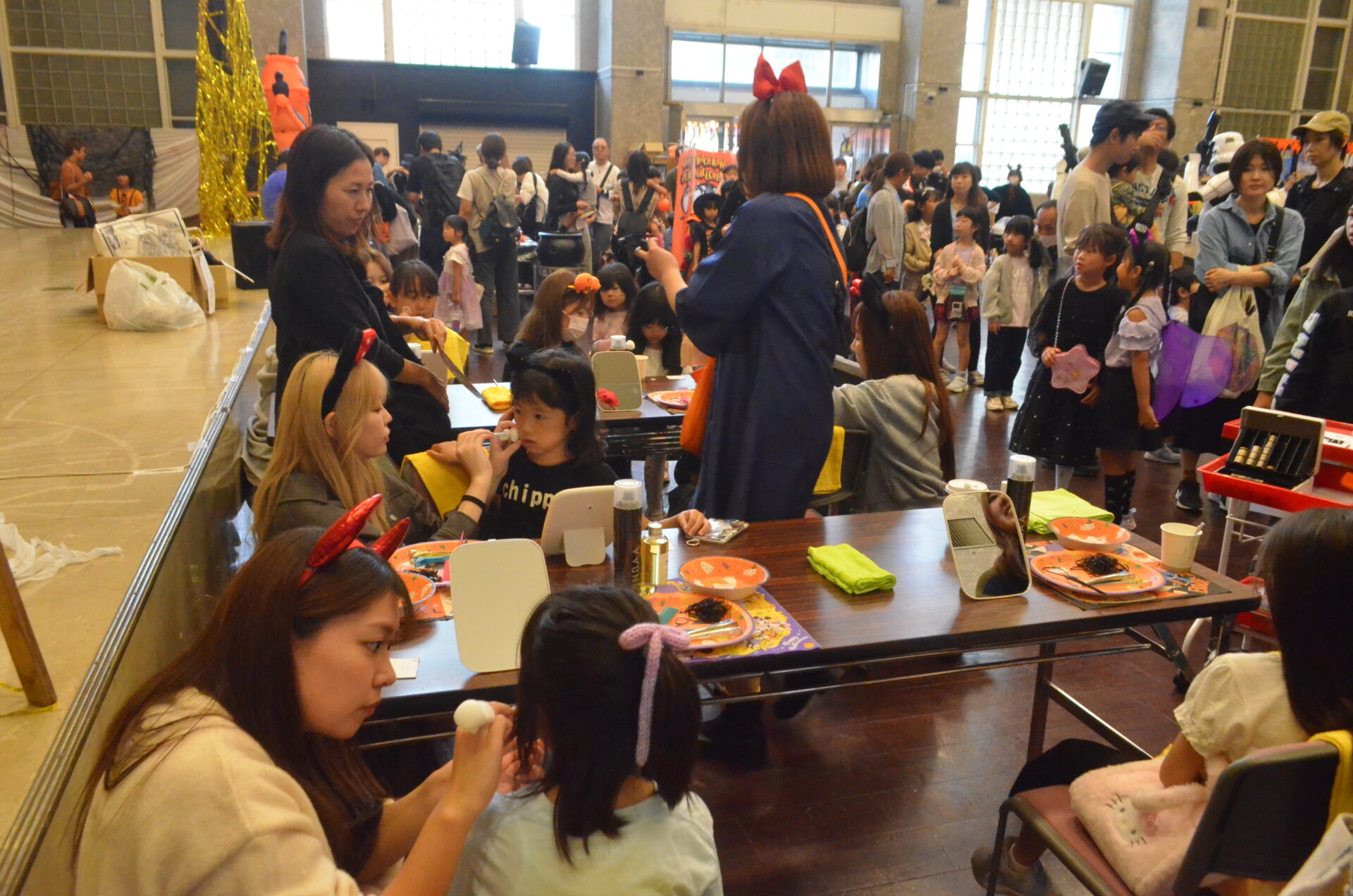 午前10時の開始と同時に仮装した子どもたちなどが会館内に入場。いくつも並んだお目当てのハロウィンワークショップに直行。中でも足利デザイン・ビューティ専門学校生によるヘアアレンジとフェイスペイントシールは大人気で、長い列もできた。このほか、ステージではリズムダンスやじゃんけん大会、巨大ゴリラの登場などがあり盛り上がりを見せていた。