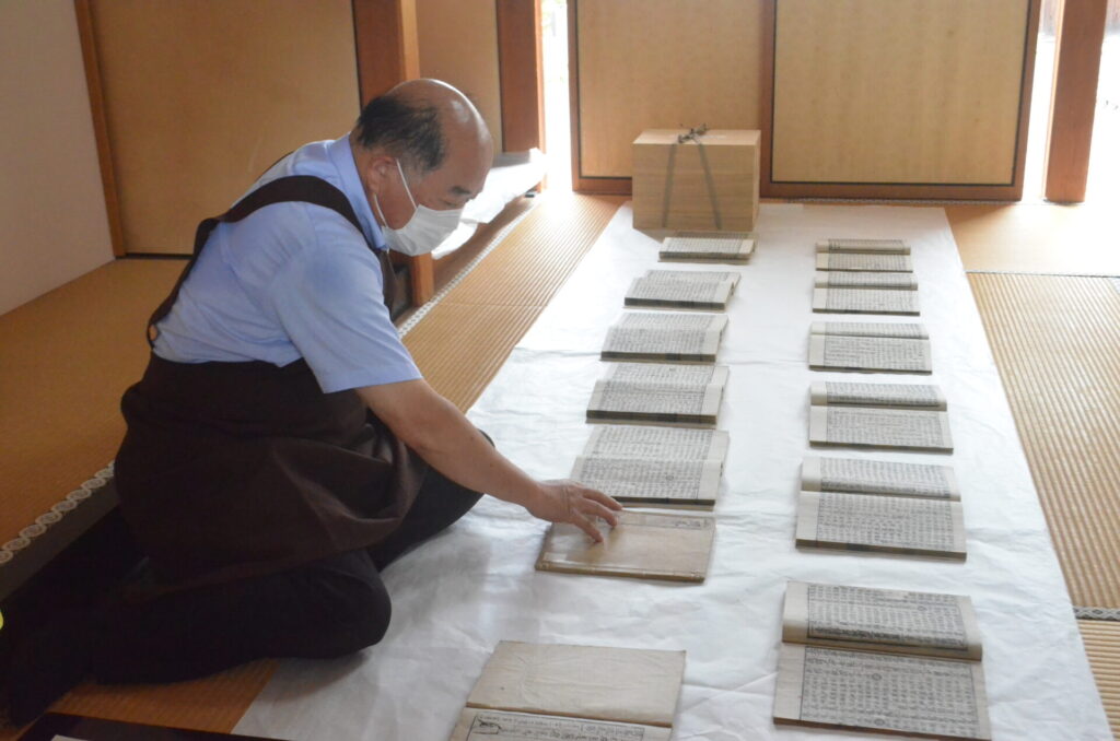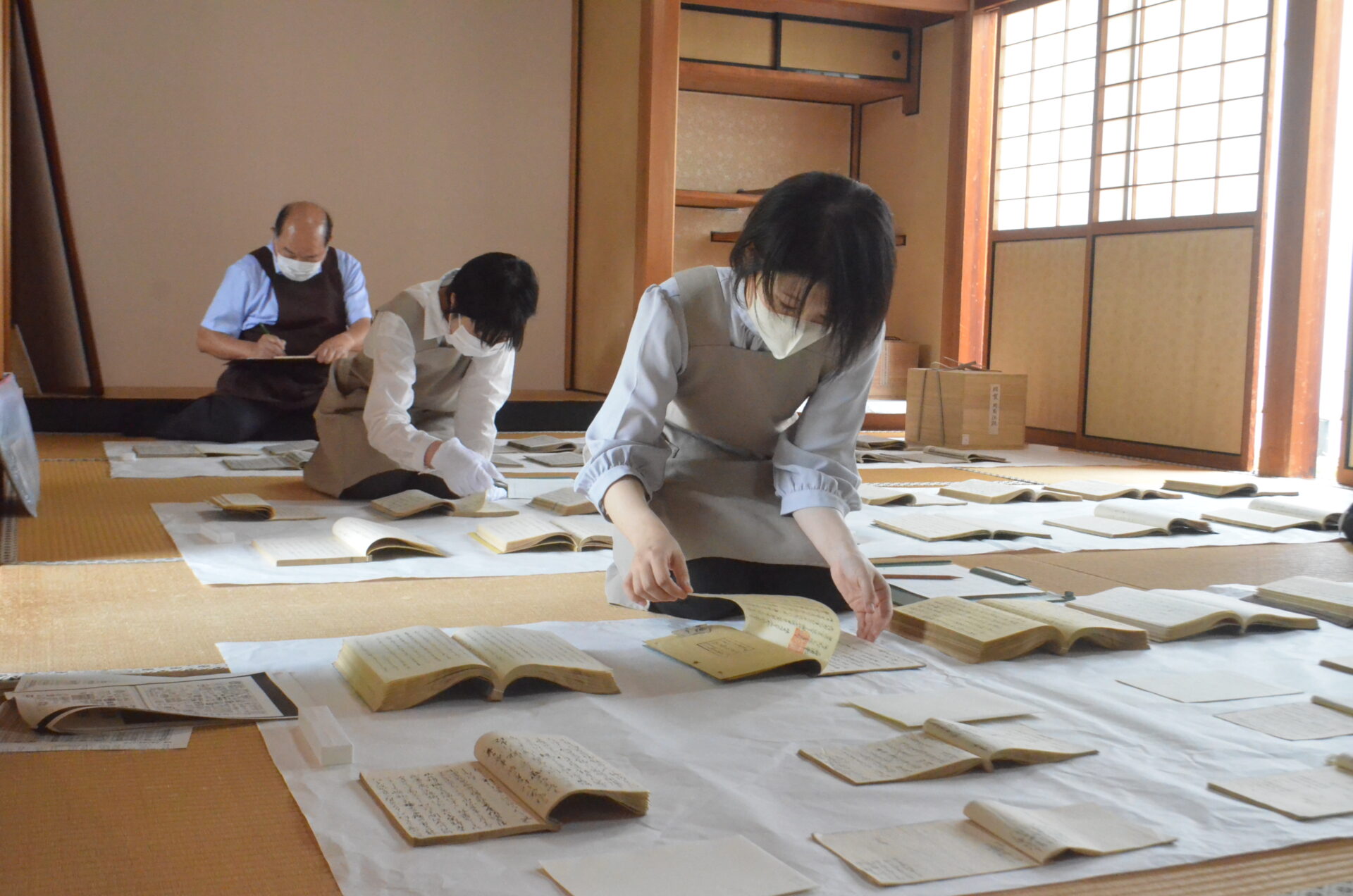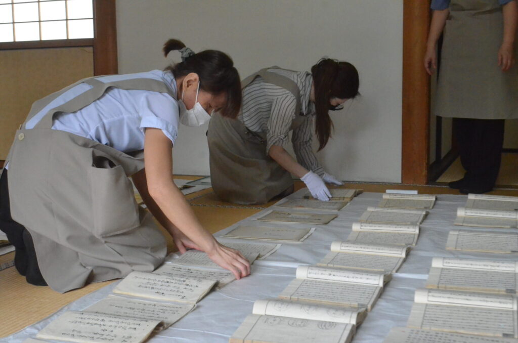 今年の初回となった10月3日には実施場所の復原建物内の書院で敷き紙の上に古書を並べ、職員が慎重にページをめくりながら綴(と)じ糸の状態やカビなどの傷みがないかなどをていねいに確認。また、入れ物である桐箱の清掃も行い、一連の作業を終えたのち、箱に戻した。