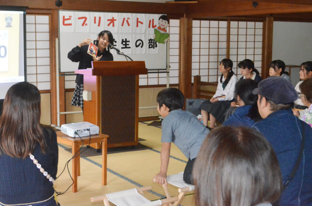 同推進委員会・桑山弘和委員長が司会を務めたバトル。出場者は5分の持ち時間で自分が面白いと思ったポイントなどを紹介。これに対するディスカッションでは聴講者からいくつも質問が出るなど盛り上がった。最後に出場者、聴講者で「どの本が一番読みたくなったか」を投票し、「チャンプ本」を決めた。中学生の部の参加者は「緊張したけど楽しかった」と口をそろえ、チャンプ本に輝いた本を紹介した中学生は「私の好きがみなさんに伝わったのかなと思ってとてもうれしい」と笑顔を見せていた。