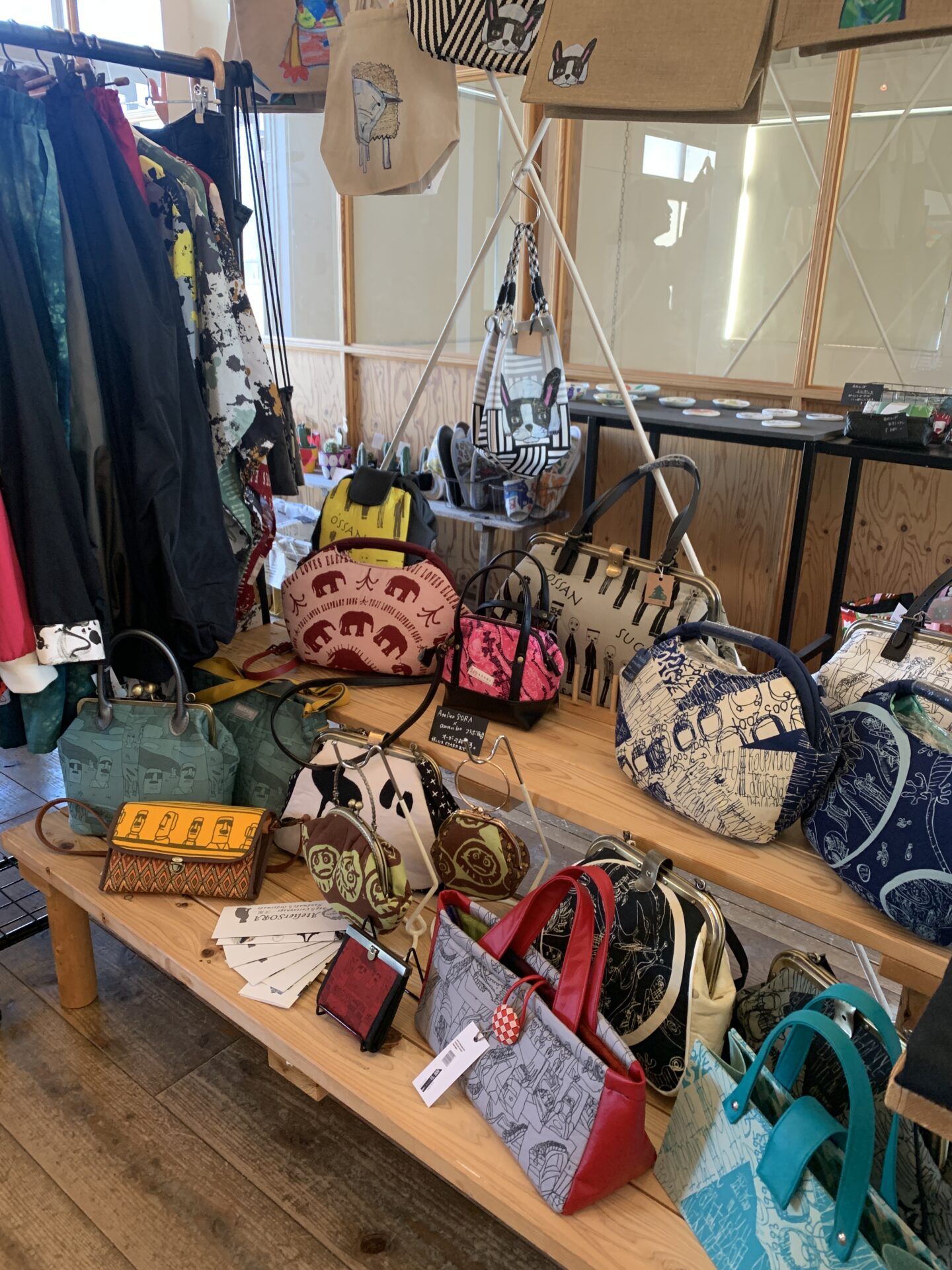 会場には作品の他に、原画をモチーフとした、Tシャツ、バッグ、手ぬぐいなどの「あめんぼグッズ」が50種類ほど揃っており、これらは桐生市・足利市・渋川市の企業5社、デザイナーたちが協力し、あめんぼ作家の作品を商品化したものだとのこと。各アイテムの合計は200種類くらいになるという。