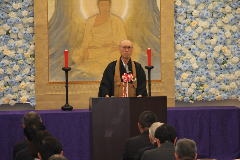 はじめに同記念法要が営まれ、聖歌隊の「いまささぐ」斉唱の後、導師は表白の中で「この時を足利大学繁栄のチャンスと捉え、次世代に向けた再スタートであることを肝に銘じる」と語った。 続いて100周年記念式典に移り、同法人理事長 武井全補氏が挨拶し、足利仏教和合会と市井の有権者の尽力により、足利実践女子学校が創立できたことに謝意を述べた。さらに、建学の理念を各宗派を越えて聖徳太子十七条件憲法にある「和を以って貴しと為す」としたことを讃えた。また「近年の社会の変化に伴い、世界的課題のカーボンニュートラル、地域や企業の最適化をなすDX(デジタルトランスフォーメーション)、国際交流の3つを柱とし学修指導の根本に据え「和の精神』をふまえた教えを続ける」とし「教育は国家百年の計とあり、一つの方向性を見つけ地域社会と共に精進していく」と結んだ。