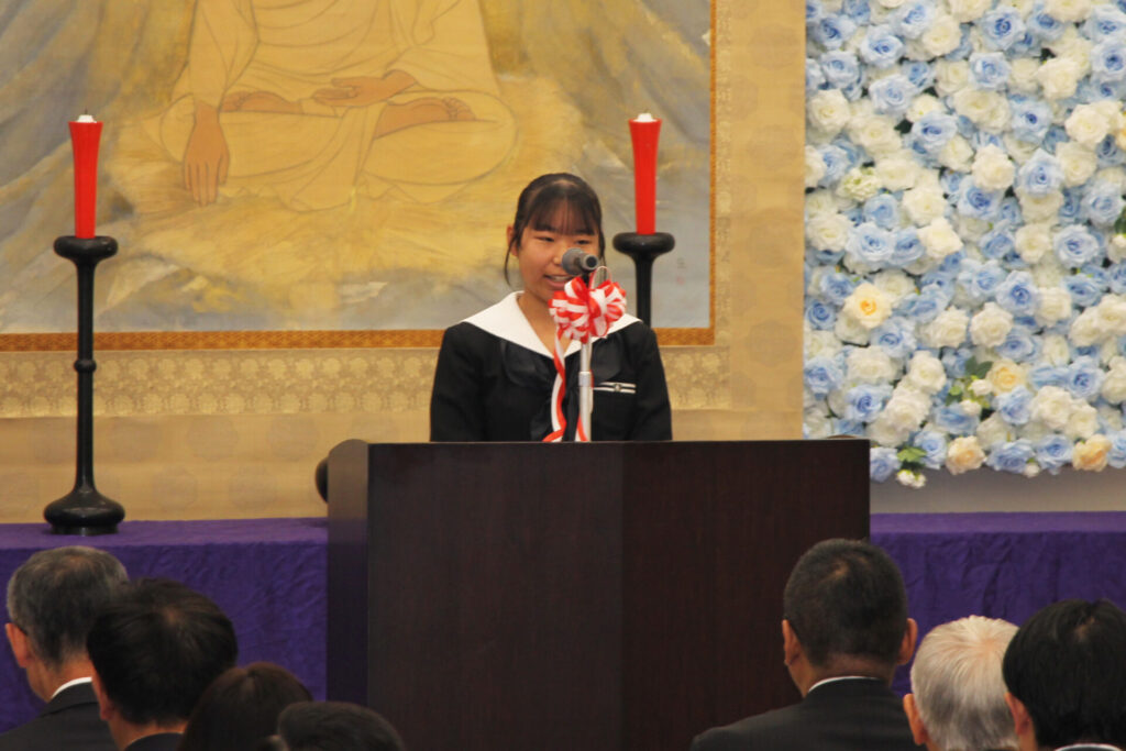 祝電の披露の後、足利大学附属女子高等学校 生徒会長 小内唯愛さんがお礼の言葉を述べ「多くの伝統行事の中で一番大切にしていることは、生徒全員で行う正座とその後の『和を以って貴しと為す』の唱和の時間です。これからも和の精神を大切に百年の伝統を継承して行きます。」と力強く語った。