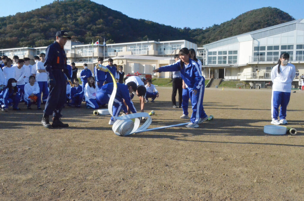 当日は市消防団・樋口泰正団長と第6、第7分団員、市消防職員、県の消防担当職員が来校。生徒たちは消防団の活動内容や入団したきっかけなどを聞いたのち、学年ごとに団員の指導を受けながら放水やホースの延長などを体験。
