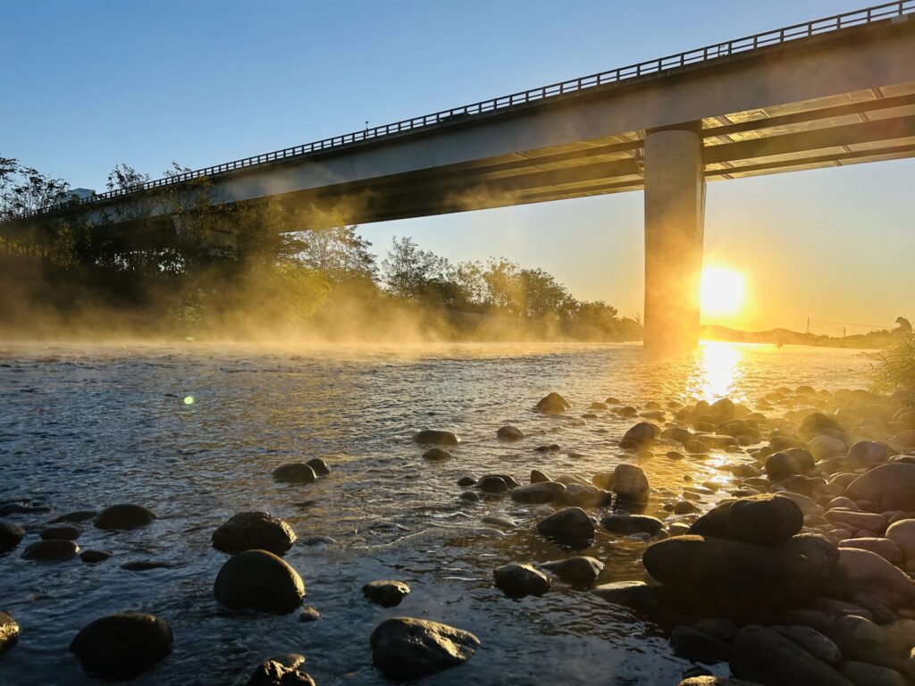 早朝に渡良瀬川沿いを歩くと、澄んだ空気に水面の蒸気が朝陽に照らされて神秘的な雰囲気を醸し出しています。