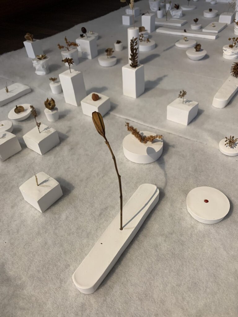 展示会場の庭の松や柊の樹々に惹かれ、タイトルを《水と風の道》としました。人は土と生きています。庭とこの家から水と風の流れを感じます。