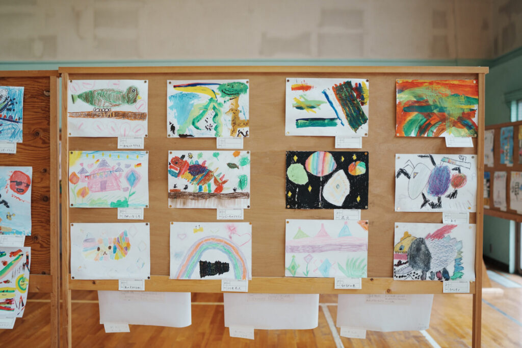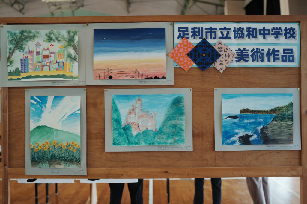 体育館では、御厨小学校と協和中学校の児童生徒による絵画などの作品が並び、保護者や地域住民が鑑賞した。学習の成果が反映された作品が多く、幅広い年代の表現が確認できた。