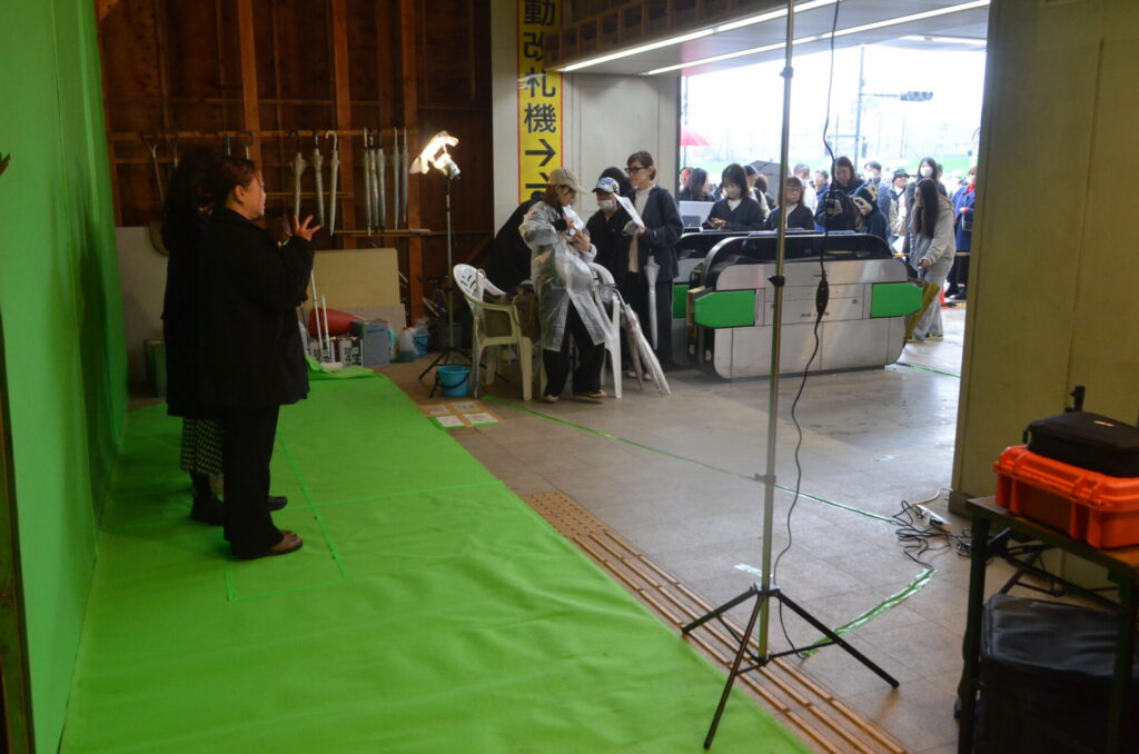 悪天候の中、オープンの4時間前の午前6時から並ぶ人もいるほどの人気ぶり。今回は同スタジオの特徴であるグリーンバックを使用し、150組限定でスクランブル交差点を背景とした合成撮影が楽しめるフォトブースを開設。体験した女性は「楽しみにしてました。2分ほどでチケットが終了していたので、手に入れることができてラッキーでした」と喜んでいた。