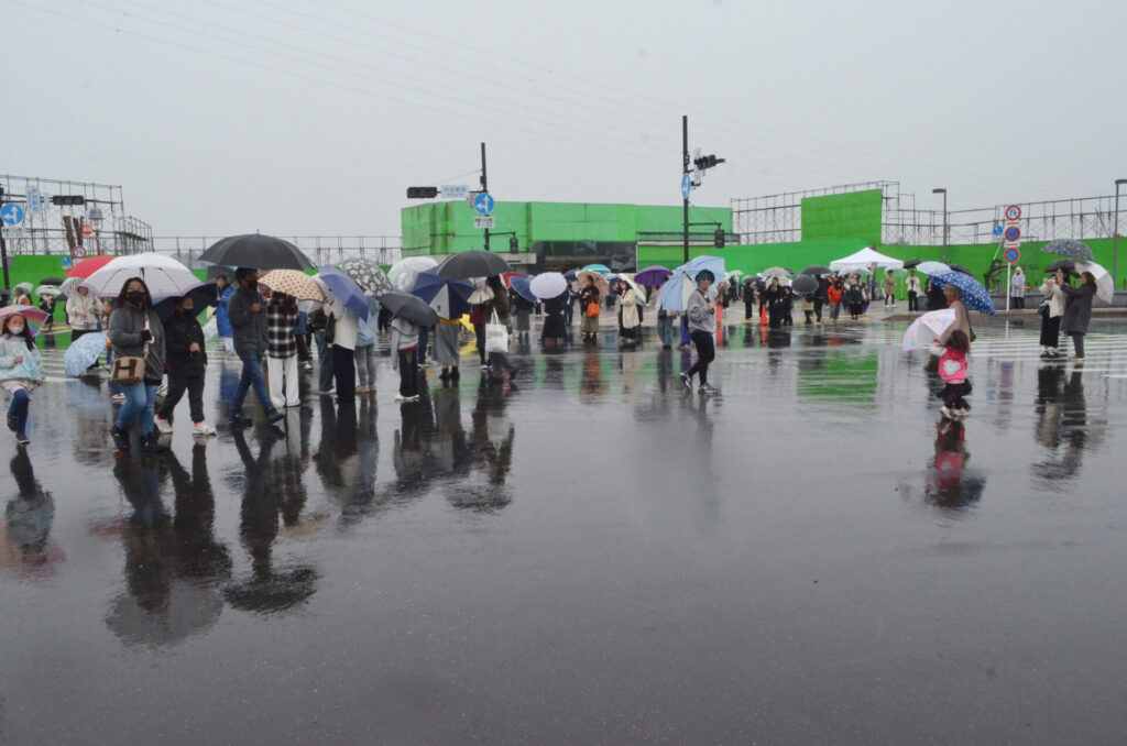 東京・渋谷のスクランブル交差点を模した足利市五十部町の「足利スクランブルシティスタジオ」の一般公開が11月9日に行われ、雨の中、全国から過去最多となる6150人が来場して傘の花を咲かせ、映画やミュージックビデオで使用されたお目当てのポイントを探して写真や動画撮影を楽しんでいた。
