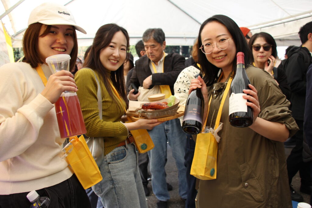 女性3人組はワインと料理をゲットしてこの笑顔!