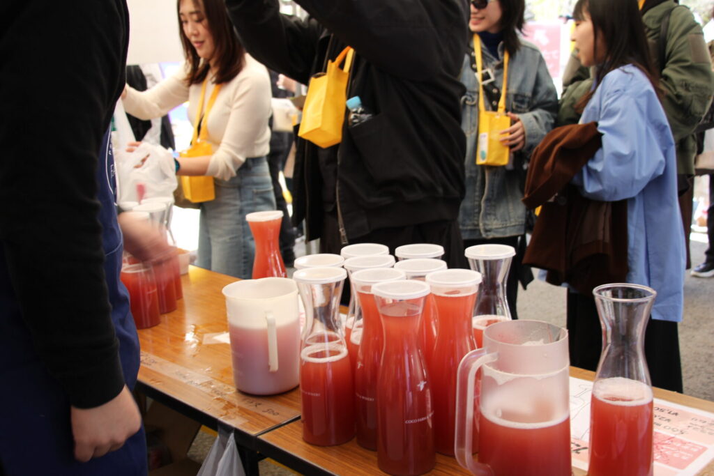 同収穫祭の一番のおすすめは、会場でのみ味わえる<できたてワイン>。酵母が生きている微発泡のフレッシュでフルーティなワイン。軽やかな飲み心地で、このワインを目当てに来場するファンも多い。