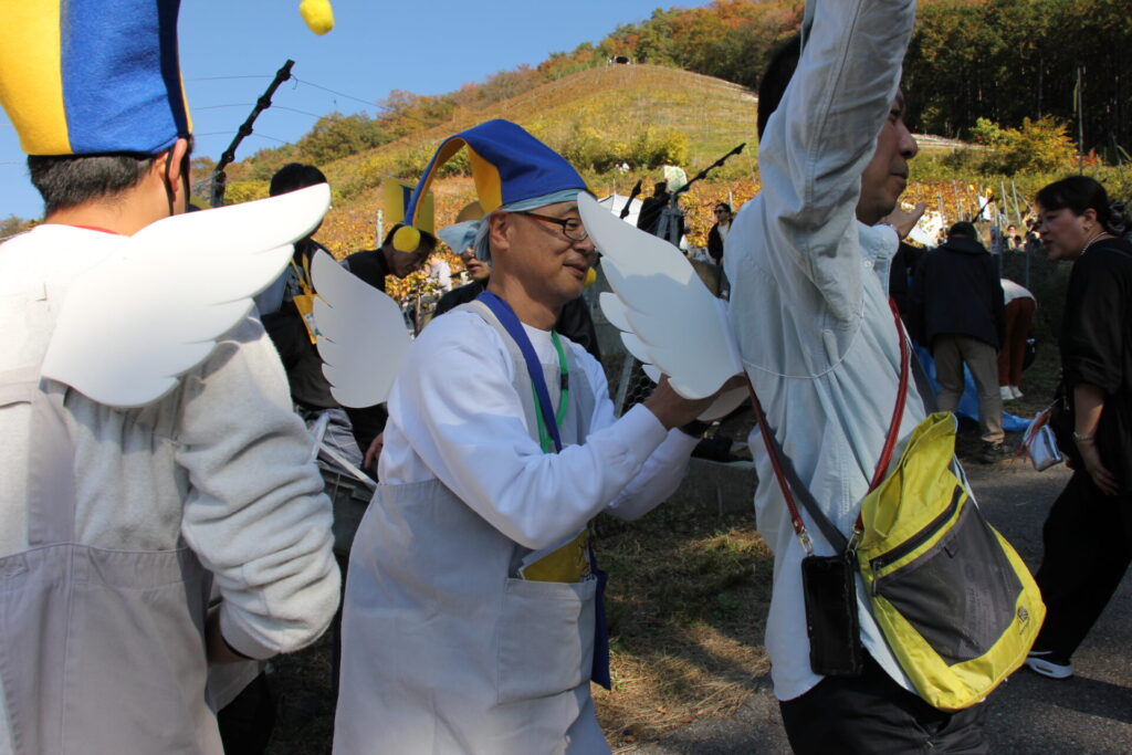 「バスをチャーターして東京から50人ほどできました。頂上組はこの8人です。この収穫祭参加の主催者は日本酒の製造に携わってる方です。我々は初参加で、自営業が多く職種もバラバラ。お酒好きの集まりといった感じです。この景色も収穫祭の雰囲気も素晴らしいです。何と言ってもできたてワインは最高ですね。美味しいです!」