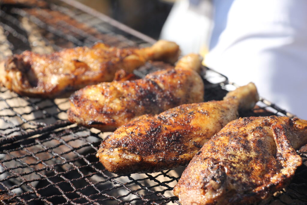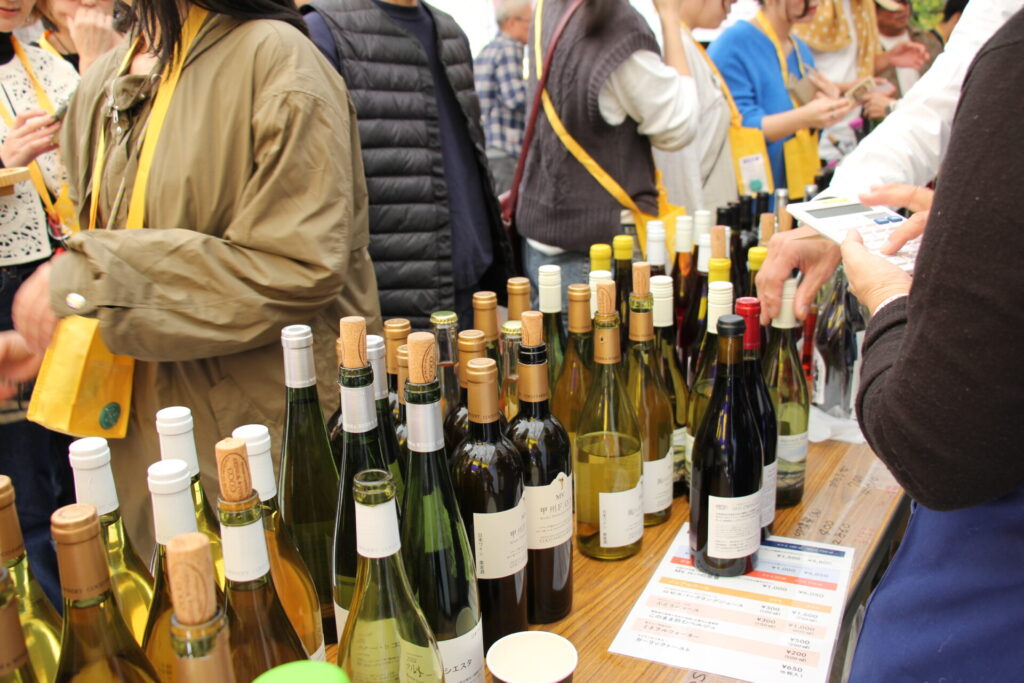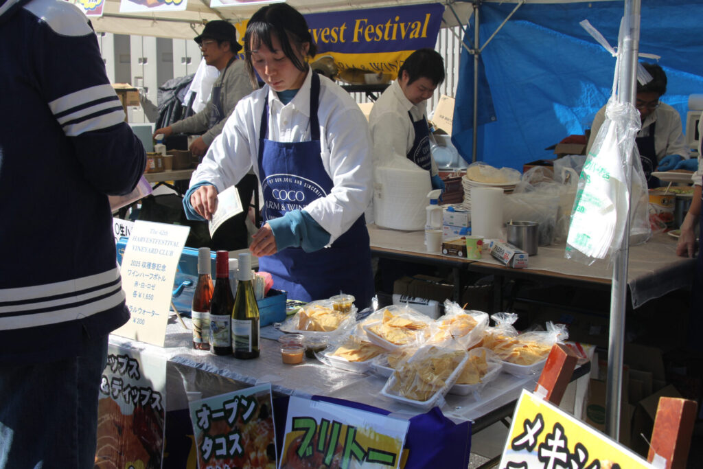 また、ワインに合う料理も魅力の一つ。骨付きソーセージ、アヒージョ、生ハム、チーズプレート、メキシカンチキンなどが、フードコート広場や葡萄畑下の各所で、食欲をそそる匂いを立ちのぼらせていた。