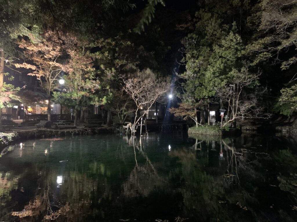 ライトアップされる出流原弁天池を望む、赤見温泉 ホテル 一乃館の尾花社長は「この時期は周辺の紅葉が美しく、近隣のあしかがフラワーパークでは、イルミネーション『光の花の庭』の開催期間となっています。双方を訪れ多くの方に楽しんでもらいたいと企画しました。」と語る。