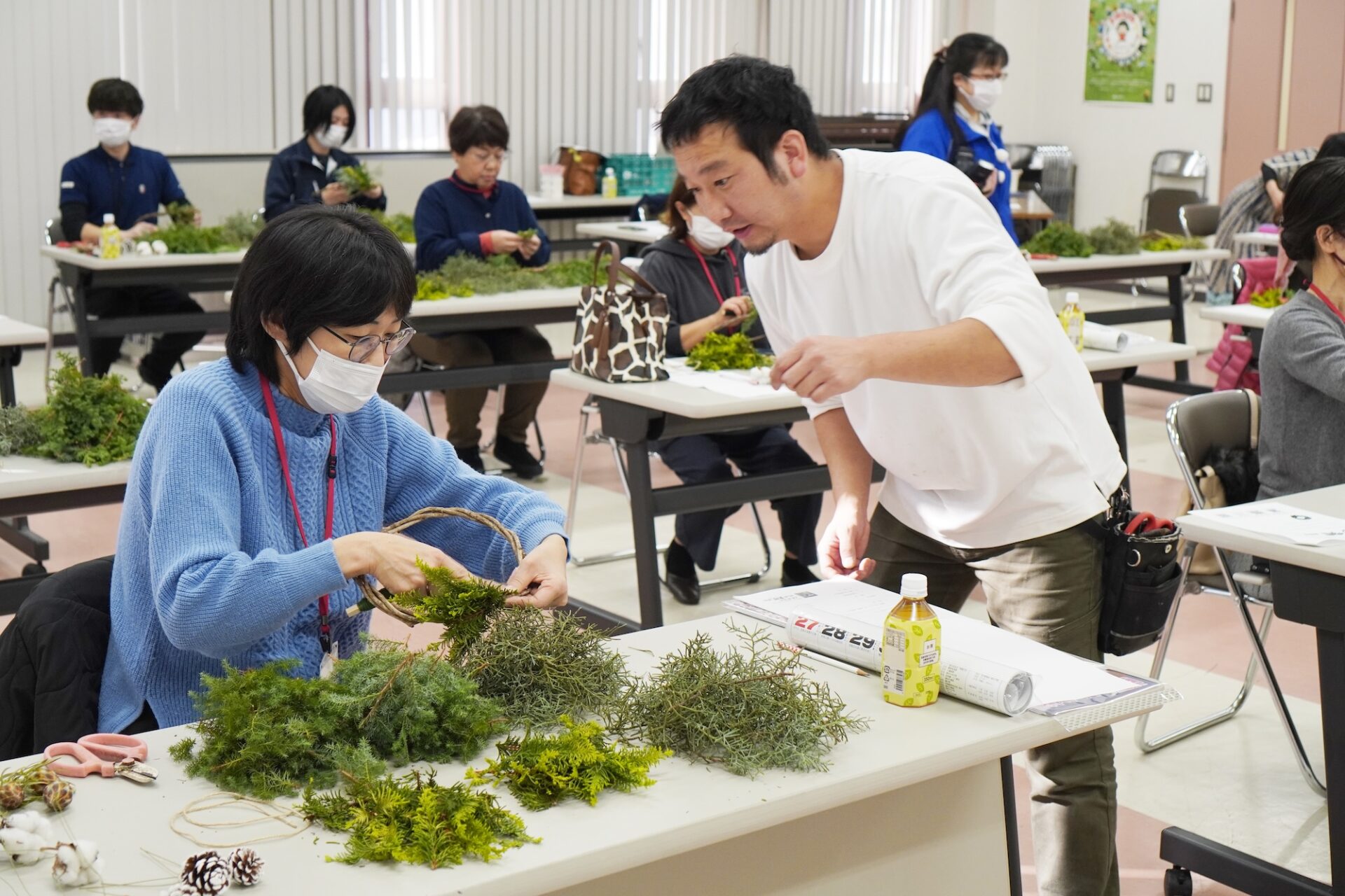リース作りには13人が参加。フジのつるをベースにクジャクヒバ、ブルーアイス、プルモーサム、コットンなどの素材を使用し、館林、足利市内で生花店を営む横塚寛幸さんの指導を受けながら、完成させた。受講生は「流れをつけるのが難しかったが、とても楽しかった。どこに飾ろうかと考えています」と満足そうに話していた。