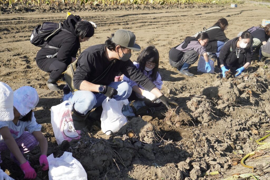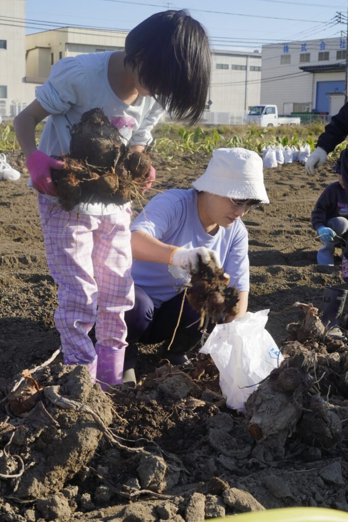 当日はJA足利根菜部の仁木肇さんのサトイモ圃場で体験。仁木さんからサトイモの栽培の歴史や種類、特徴、保存方法などを学んだ後、お待ちかねの収穫。
