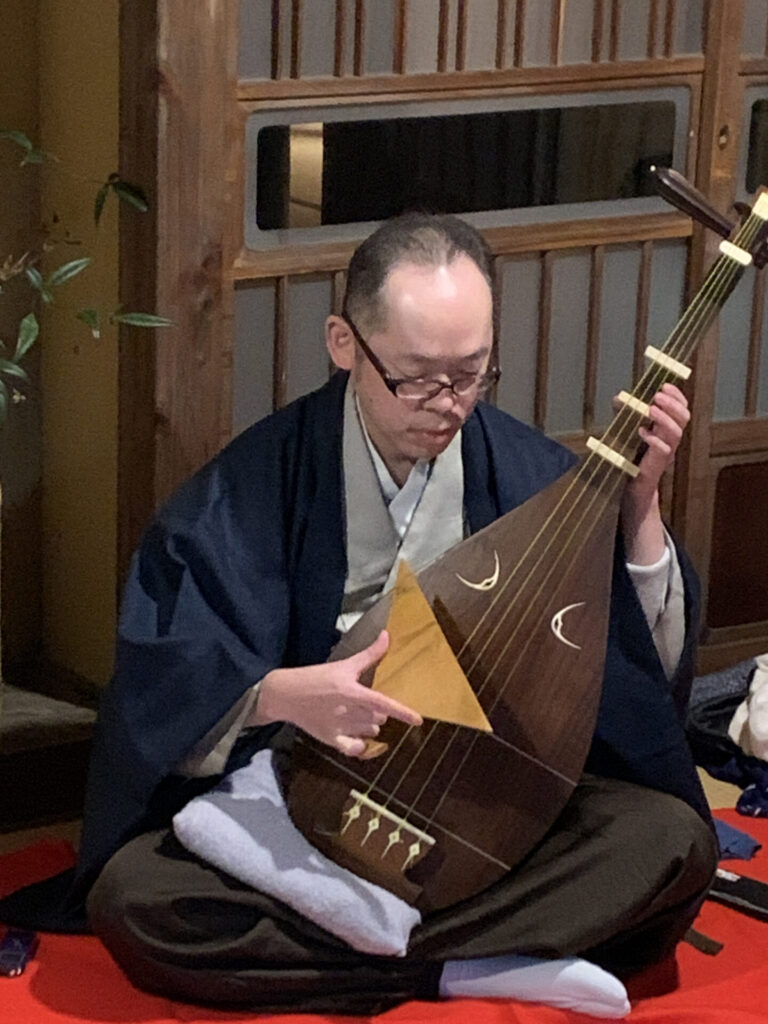 薩摩琵琶の奏者は、千葉県在住の野村洋真さん。同じく薩摩琵琶の奏者である母が、当地を訪れ庭園の美しさに感動したことから、足利庭園文化研究会との交流が始まり、今回の野村さん演奏会に繋がった。オリジナル曲『新藤氏庭園』『物外軒』が演奏され、来場者は琵琶の音色に聞き入っていた。演奏後は来場者より野村さんへ琵琶についての質問の時間も設けられた。琵琶の多くは古典曲で、明治・大正時代に全盛期を迎えたとのこと。奏者の声に合わせて弦を調律し、楽譜も琵琶なられはの形で伝えられている。