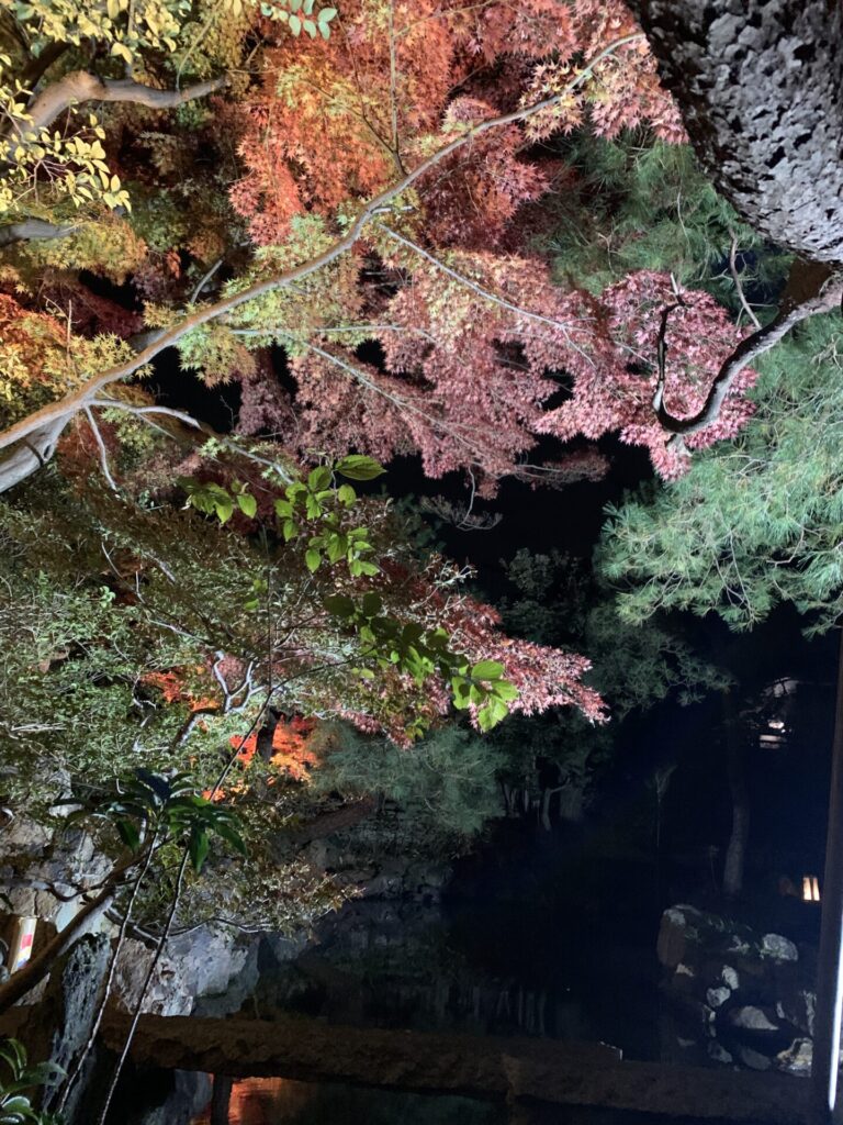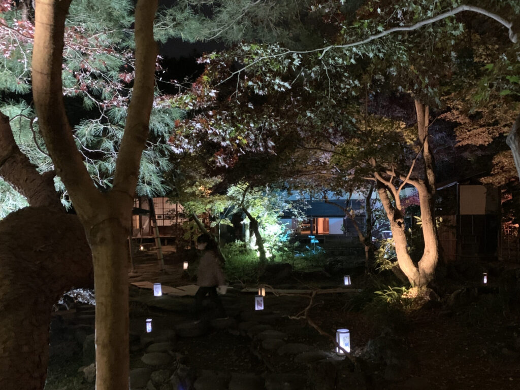 庭園は南側の茶室に付随する二重露地と北側の小高い築山と池部分の二構成になっている。紅葉の紅色がライトアップでより際立ち美しい。