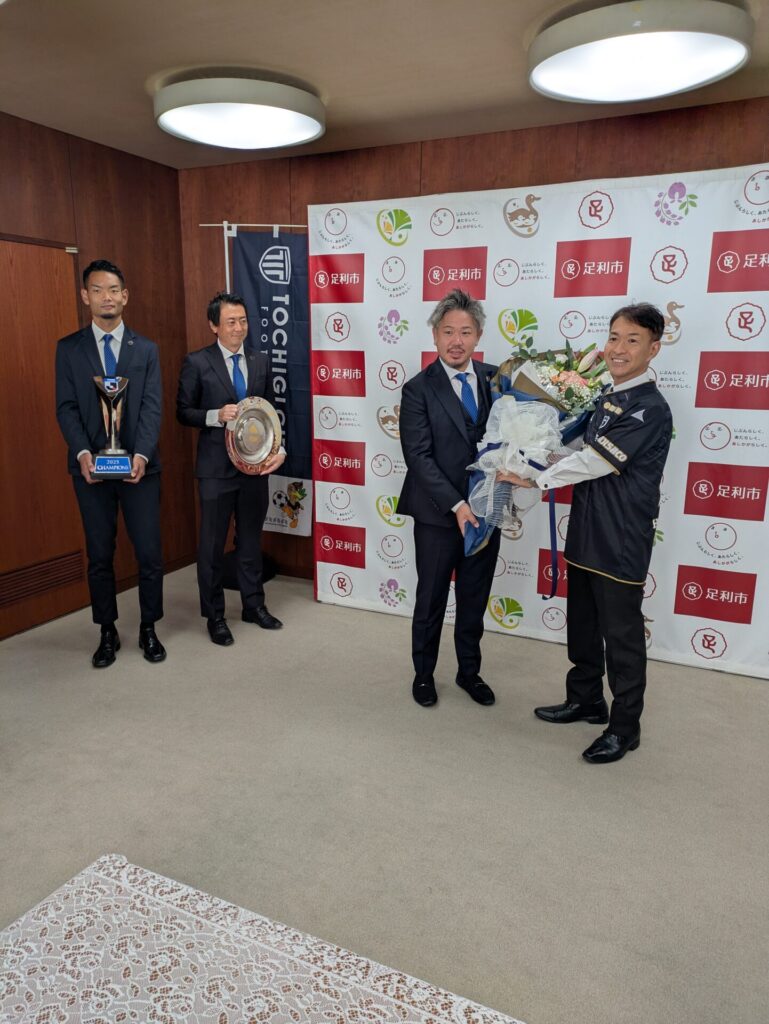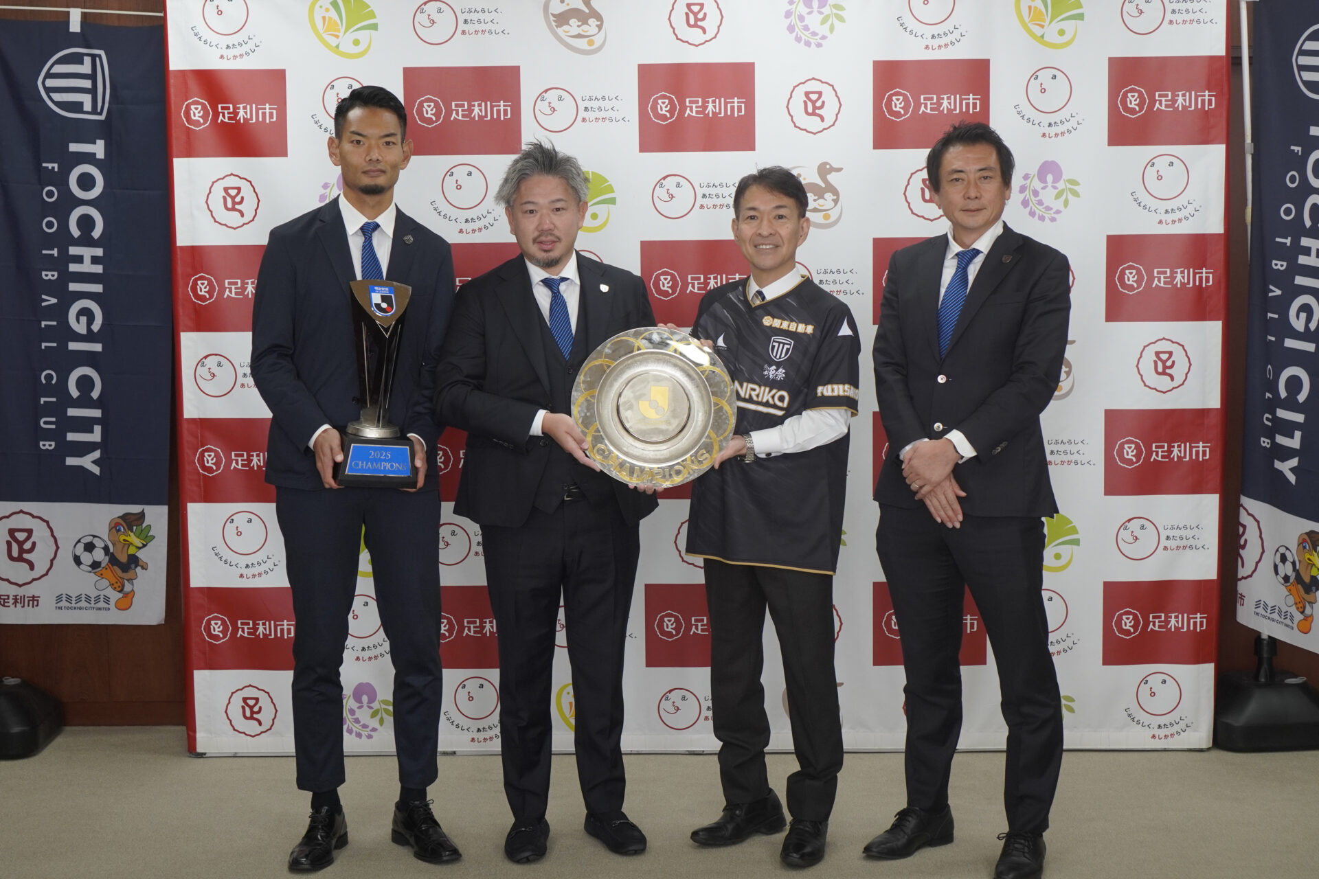 サッカーJ3で優勝を果たし、来季J2に昇格する栃木シティの大栗崇司社長、今矢直城監督、内田錬平キャプテンが12月5日、足利市役所に早川尚秀市長を表敬訪問。結果を報告するとともに来季の抱負、また、市民の応援への感謝の気持ちを伝えた。