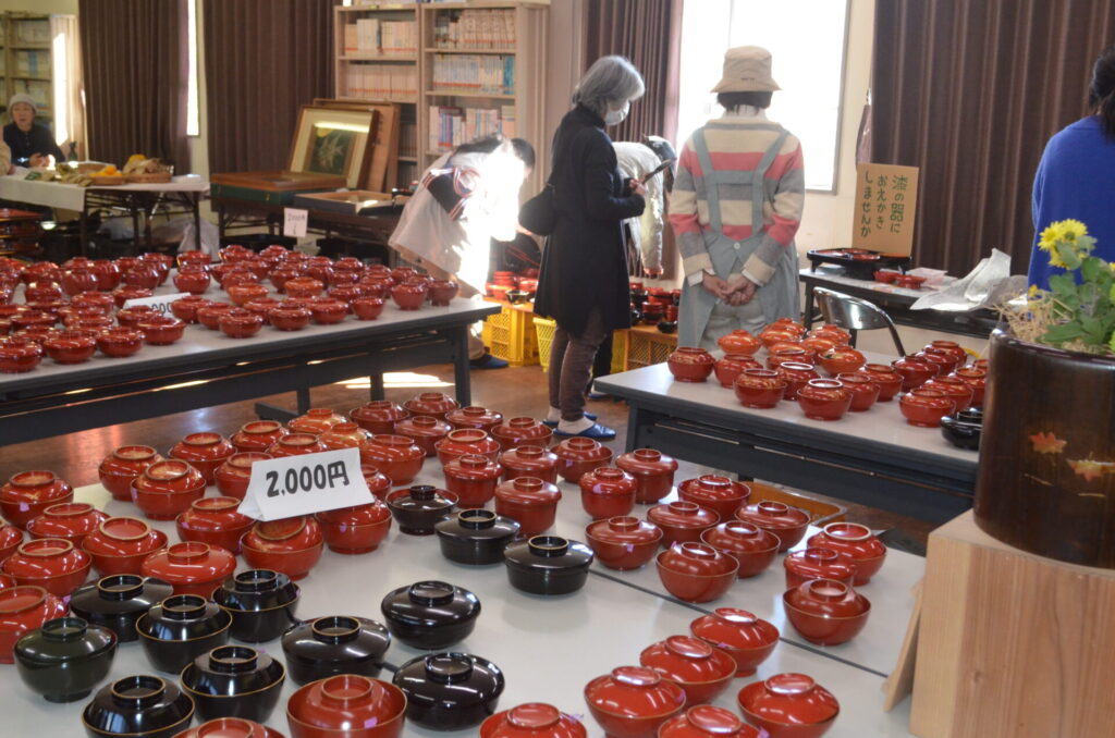 当日は販売開始前から来場者が並ぶ人気ぶり。今回は特に箸がよく売れた。また、初めての試みとして傷のついた漆器に絵を描くワークショップも行われ、多くの人が体験していた。