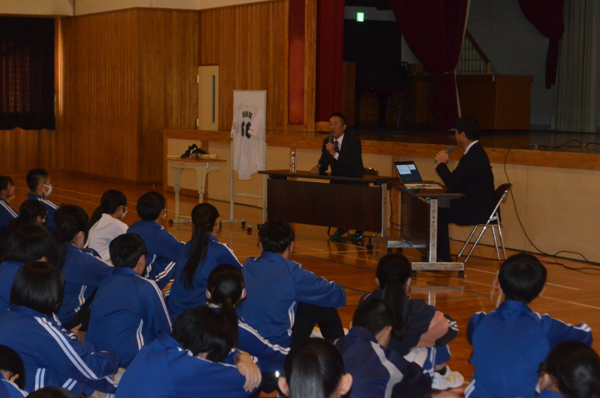 これからさまざまな進路選択に出会うであろう中学生たちに「最終的に決めるのは自分だが、いろいろな人に相談し、話を聞いて判断して欲しい」とし「とにかく中学生の今しかできないこともあるので思い切ってチャレンジしてみよう」とエールを送った。野球部で活躍した3年の藤本凌也さんは「自分もプロになりたいのでとても参考になりました。岡田さんのように見えないところでも努力していきたい」と話した。