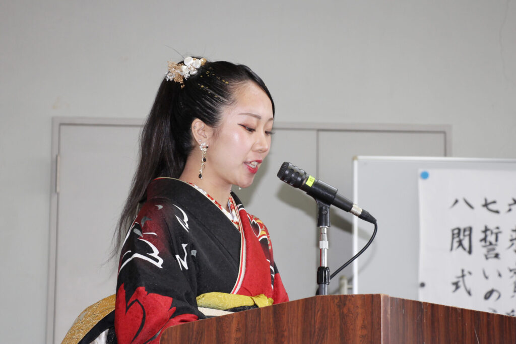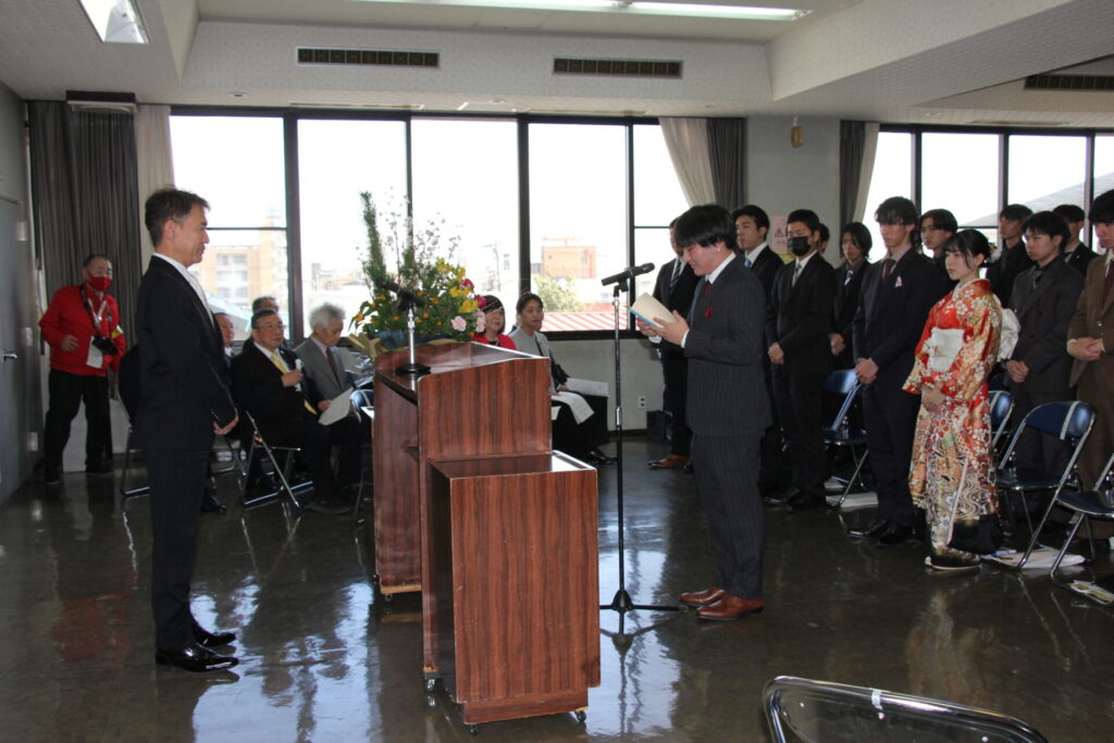 また、誓いの言葉は出席者を代表し、冨岡滉輝さんが「世界が大きく変わる時を、自らの手で未来を創造する時代と捉え、果敢に取り組んでいく覚悟です。そして社会の一員としてその発展に貢献することを誓います。」と力強く語った。