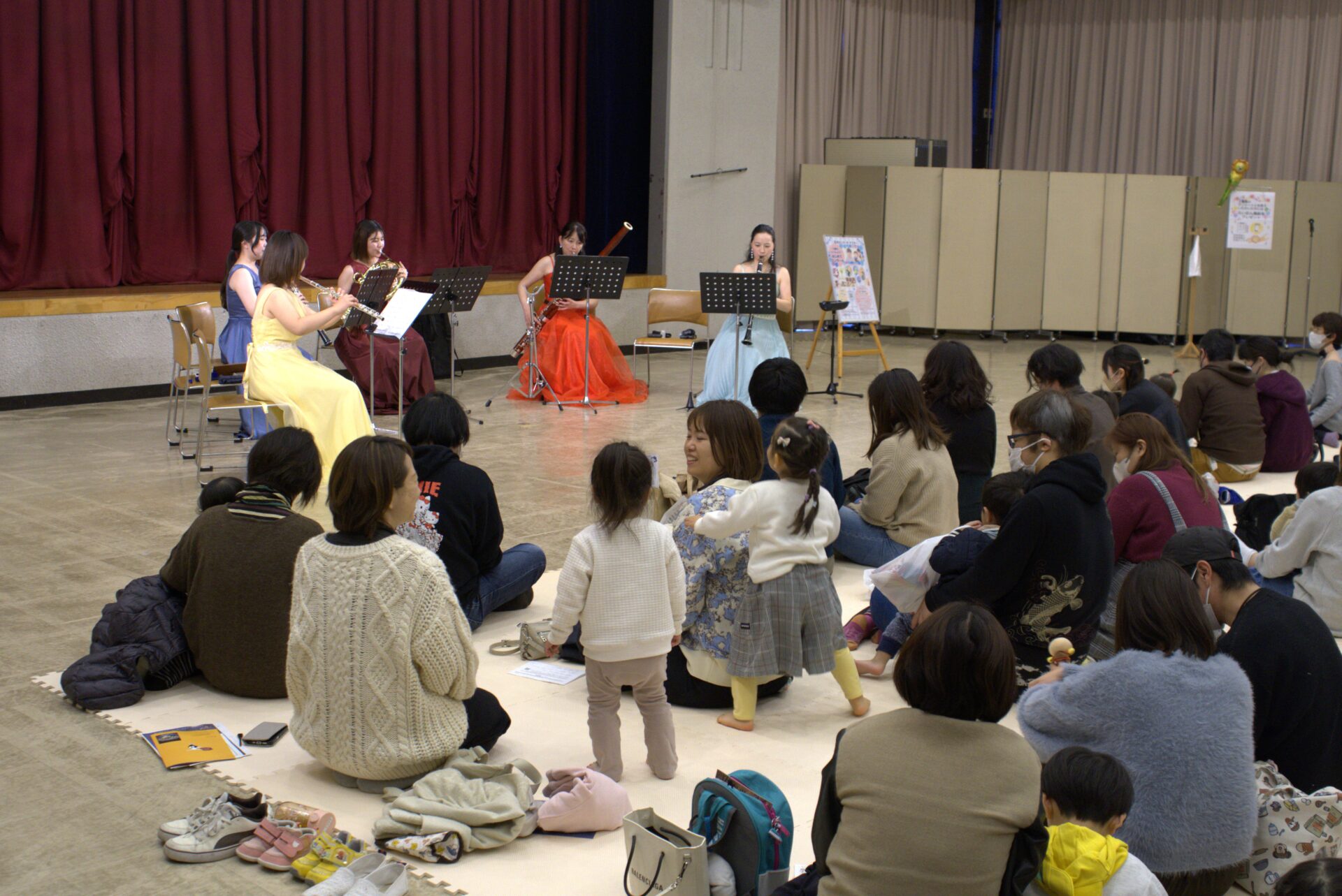 はじめてコンサートは金田桃子さん(フルート)、三瓶みおりさん(オーボエ)、勅使河原由香さん(クラリネット)、関本ささらさん(ファゴット)、河本美紀さん(ホルン)による木管五重奏。