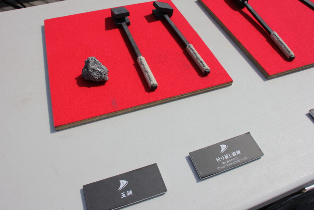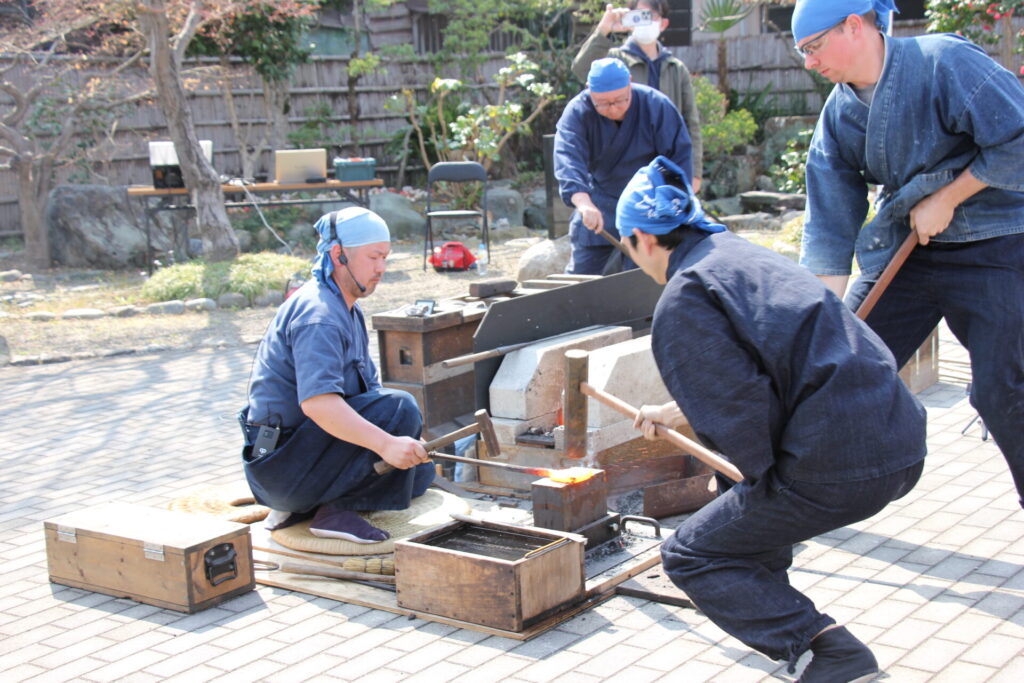 鍛錬は、炉の中で溶けだした鋼を取り出し、金敷に乗せて大槌で叩く作業。通常は光を落とした屋内で、鋼を入れた炉の炎の色を見ながら行うもの。横座(よこざ:火床で鋼を見ながらタイミングを管理する役)には工藤氏が着き、そのほか鍛冶スタッフとして、光綱(ジョハン・ロイトヴィラー )氏、宇賀神一三氏、天利梅翁氏が先手(さきて:大槌で叩く役)などを務めた。公開鍛錬は屋外の光の下で行うため、炎の色を見極めることが大変困難だという。真っ赤に焼けた鋼が、先手の降ろした大槌によって火の粉を飛び散らすさまを観覧者もジッと見守っていた。