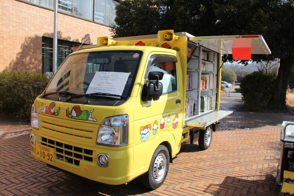 2月15日、足利市立図書館の南側正面入り口に、移動図書館「ともしび号」の新車両... -
